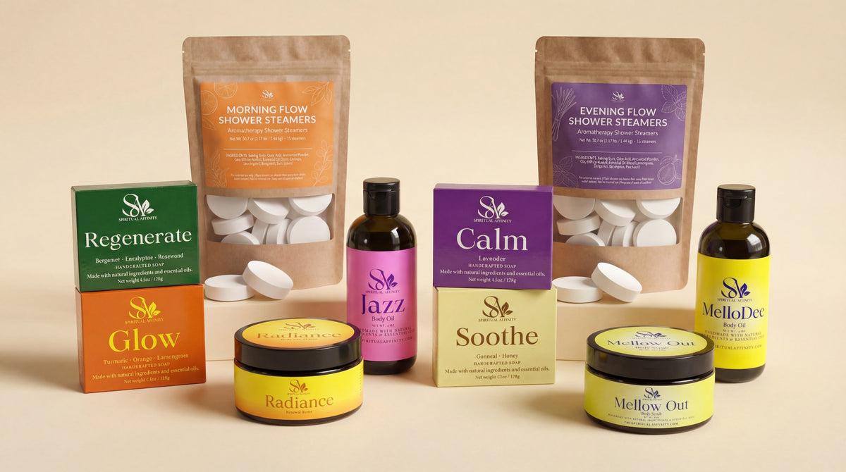 The Spiritual Affinity Complete Flow Shower Reset gives your body what it actually needs — a morning flow to wake you up grounded and an evening flow to release the day so you can truly rest. 4 soaps, 2 oils, 2 butters. One ritual that bookends your entire day.